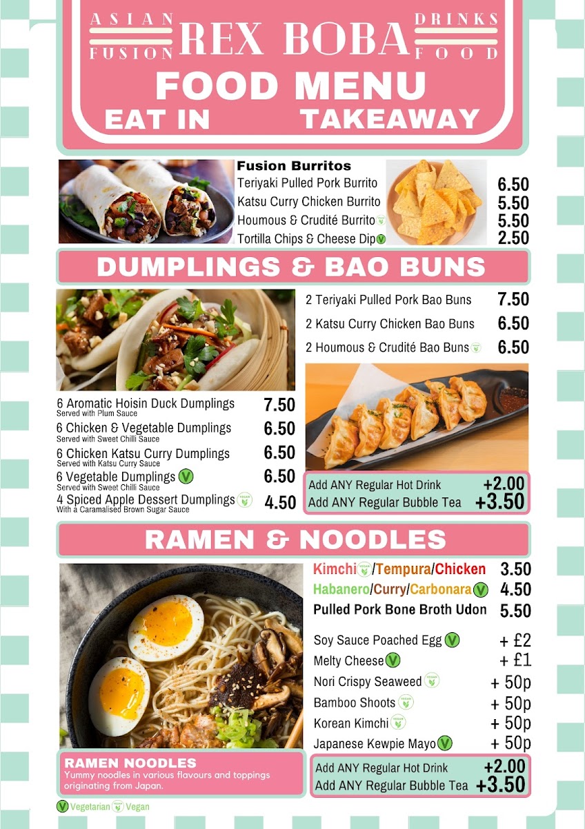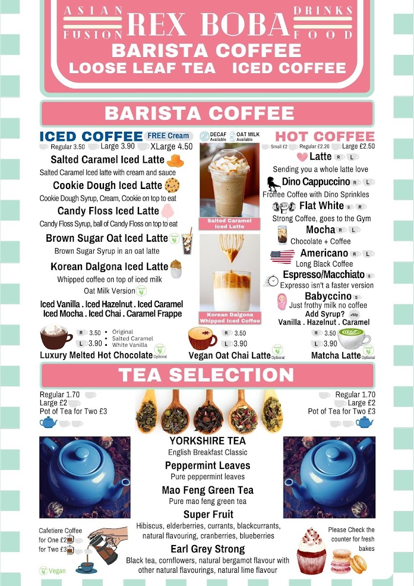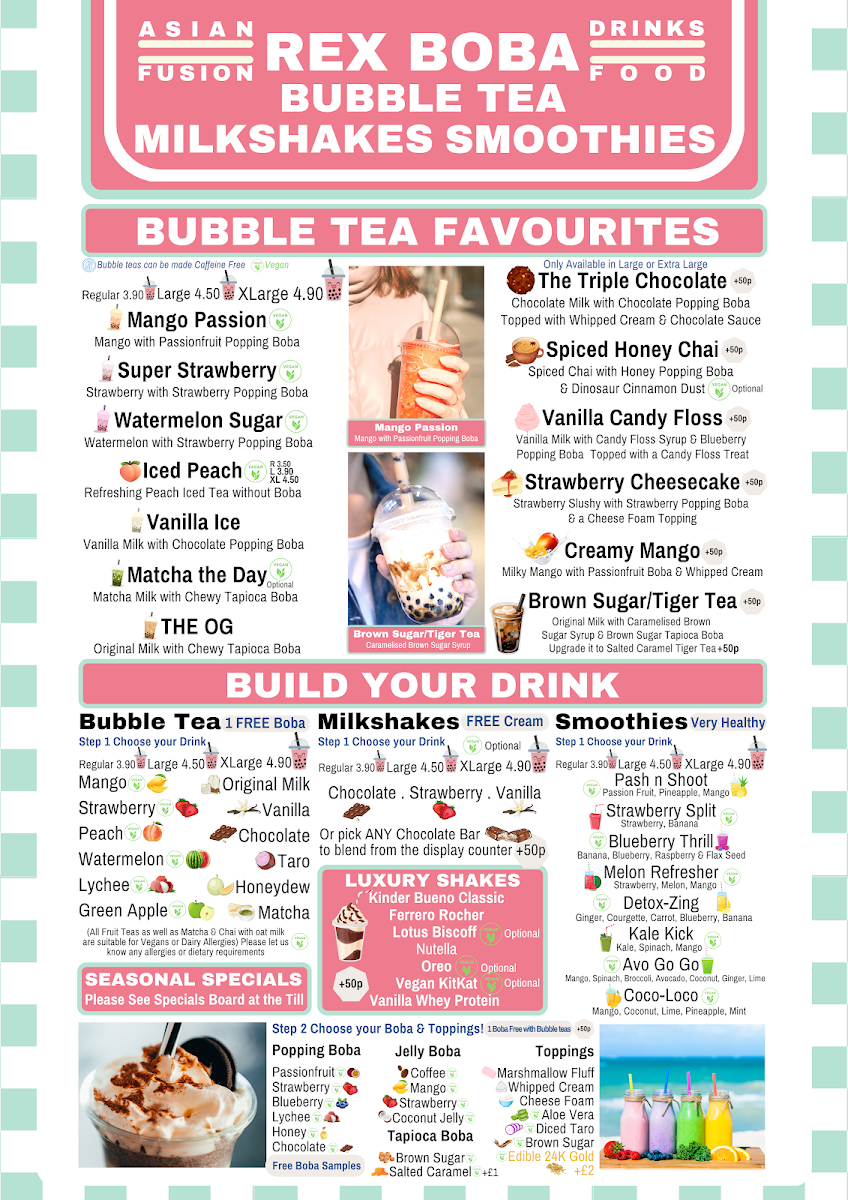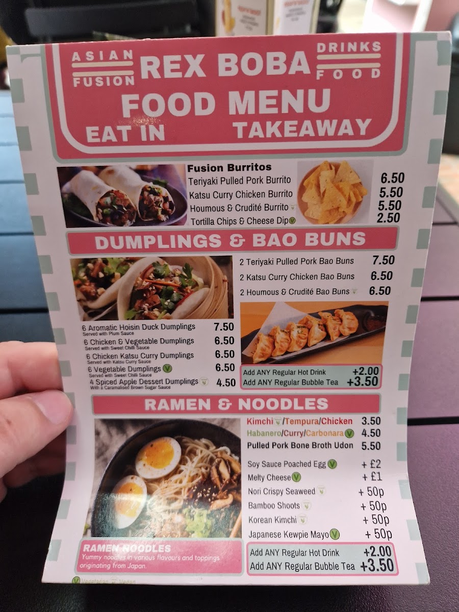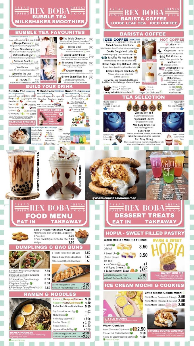 The menu at Rex Boba offers a delightful variety of options, perfect for any craving. The Drinks Menu features an impressive selection of bubble teas, including the popular Classic Milk Tea (£4.50), Taro Milk Tea (£4.80), and Passionfruit Green Tea (£4.60). For coffee lovers, the Coffee & Tea Menu has an array of options, with choices like Latte (£3.00) and Cappuccino (£3.20), alongside a selection of classic teas. Moving to the Hot Food Menu, you can enjoy comforting dishes like the Chicken Katsu Curry (£7.50), Beef Ramen (£8.00), and the hearty Vegetarian Bao Buns (£5.00). To satisfy your sweet tooth, the Dessert Menu offers treats like the Chocolate Lava Cake (£4.80) and the refreshing Mango Pudding (£3.50). Whether you're in the mood for a satisfying meal or a refreshing drink, Rex Boba’s menu offers a fantastic selection that won’t disappoint.