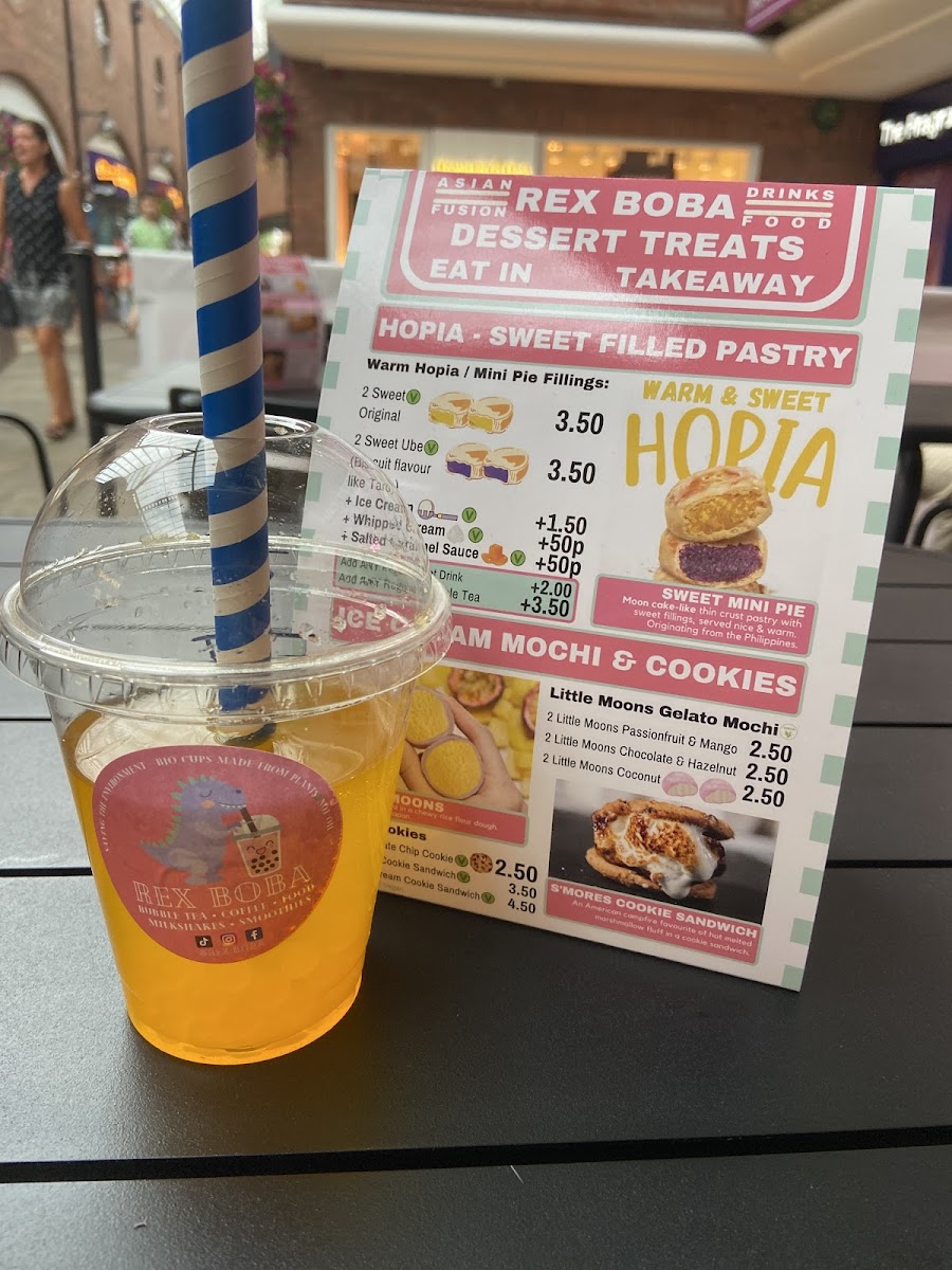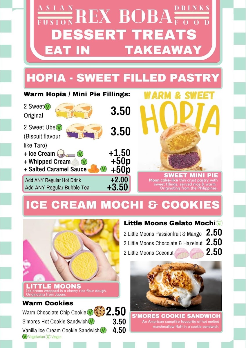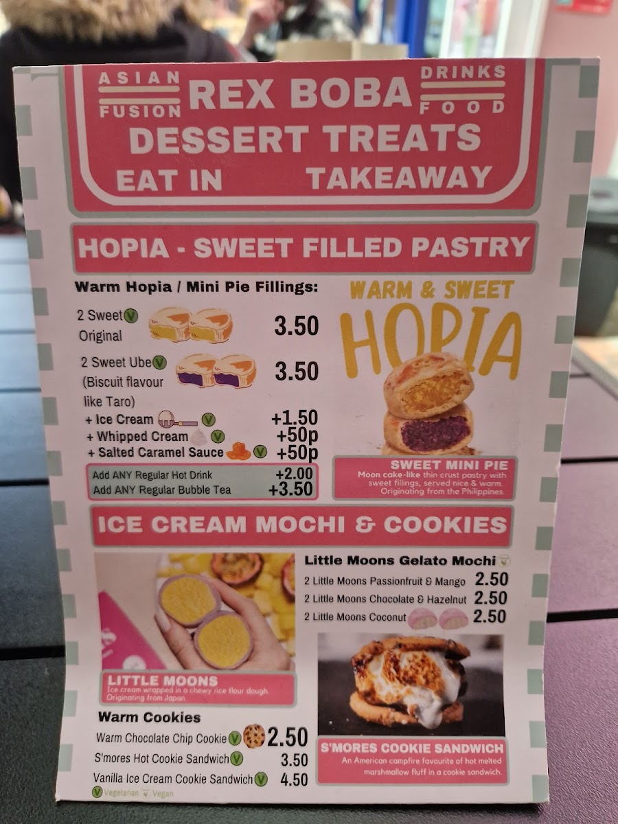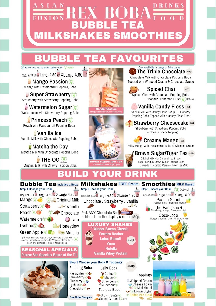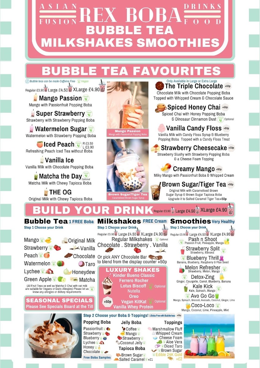 The menu at Rex Boba offers a delightful variety of options, perfect for any craving. The Drinks Menu features an impressive selection of bubble teas, including the popular Classic Milk Tea (£4.50), Taro Milk Tea (£4.80), and Passionfruit Green Tea (£4.60). For coffee lovers, the Coffee & Tea Menu has an array of options, with choices like Latte (£3.00) and Cappuccino (£3.20), alongside a selection of classic teas. Moving to the Hot Food Menu, you can enjoy comforting dishes like the Chicken Katsu Curry (£7.50), Beef Ramen (£8.00), and the hearty Vegetarian Bao Buns (£5.00). To satisfy your sweet tooth, the Dessert Menu offers treats like the Chocolate Lava Cake (£4.80) and the refreshing Mango Pudding (£3.50). Whether you're in the mood for a satisfying meal or a refreshing drink, Rex Boba’s menu offers a fantastic selection that won’t disappoint.